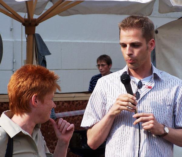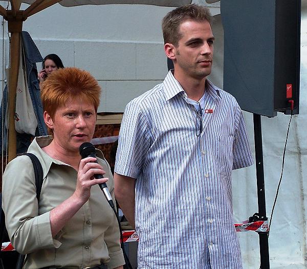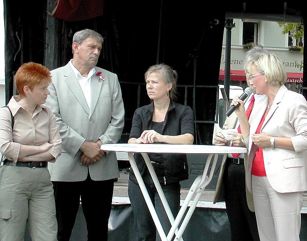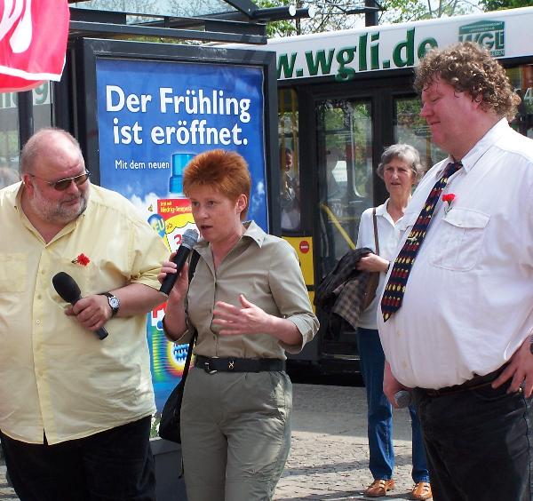Der DGB hatte die Würde des Menschen in den Mittelpunkt seiner Mai-Kundgebungen gestellt. Petra Pau diskutierte auf der zentralen Brandenburger Mai-Kundgebung, in Potsdam, mit Gewerkschaftern und Politikerinnen. In Köpenick erläuterte sie ihre Mindestforderungen zur Änderung von Hartz IV. Und im Bötzow-Viertel warb sie gemeinsam mit dem PDS-Landesvorsitzenden Stefan Liebich u. a. für ein großes Fest am Brandenburger für Demokratie und Frieden zum 8. Mai, dem Tag der Befreiung von Faschismus und Krieg. |