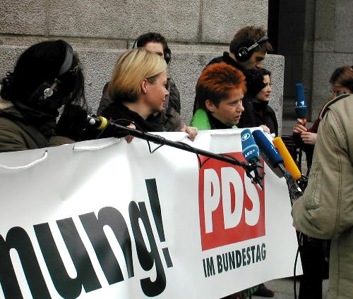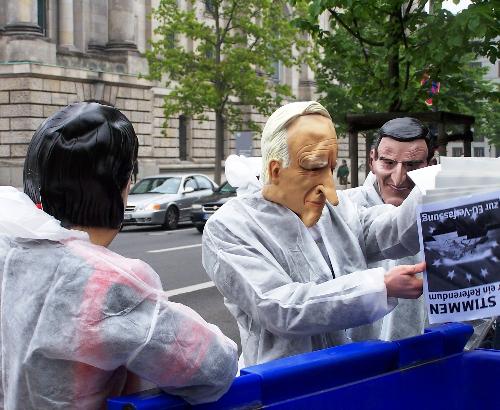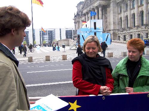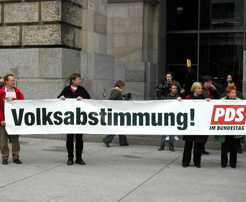 Noch einmal demonstrierten Initiativen, wie mehr Demokratie e.V und attac vor dem Bundestag für eine Volksabstimmung über die EU-Verfassung. Auch die PDS im Bundestag erneuerte ihre Forderung. Sie hatte im Parlament nur einen Partner: die FDP. Alle anderen Parteien waren dagegen, auch die SPD, auch die Grünen, obwohl sie auf Parteitagen anderes beschlossen hatten. |