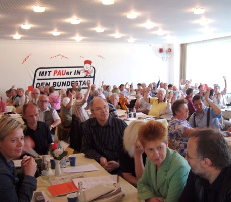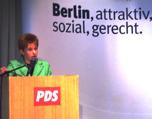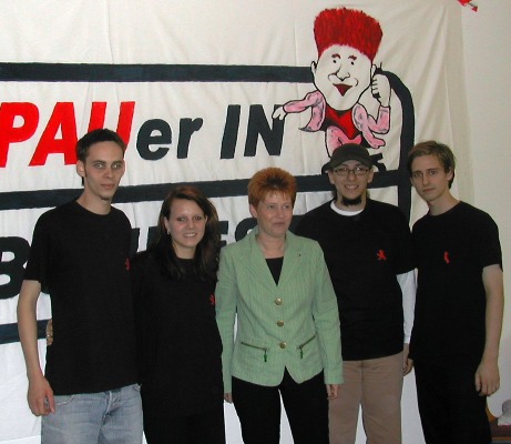 Die PDS-Jugend zeigte sich kampfentschlossen. Sie wartete mit einem Transparent auf: Mit Pauer in den Bundestag! Die Vertreterinnen und Vertreter verabschiedeten eine Erklärung, in der es unter anderem heißt: In einer neuen Bundestagsfraktion der Linken ist Petra Pau... unverzichtbar. Und als Petra Pau für eine neue Linkspartei warb, bellte sogar ein Hund Beifall. |