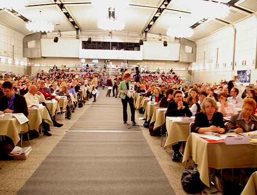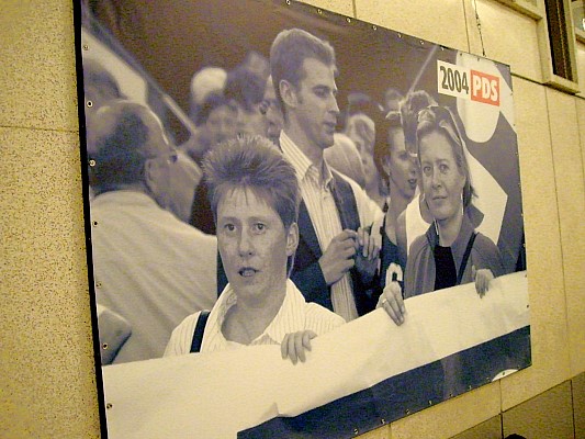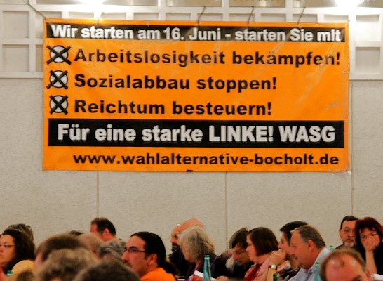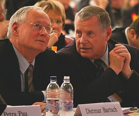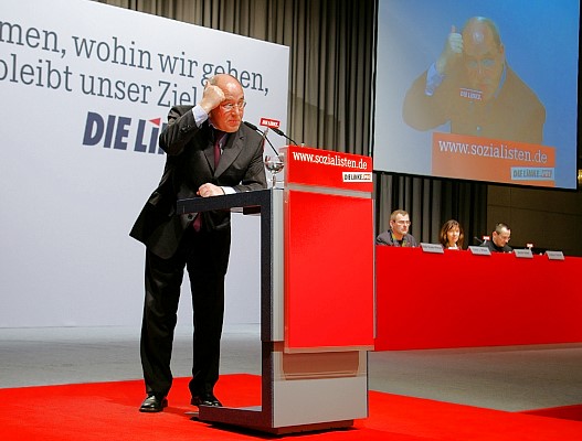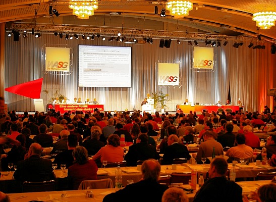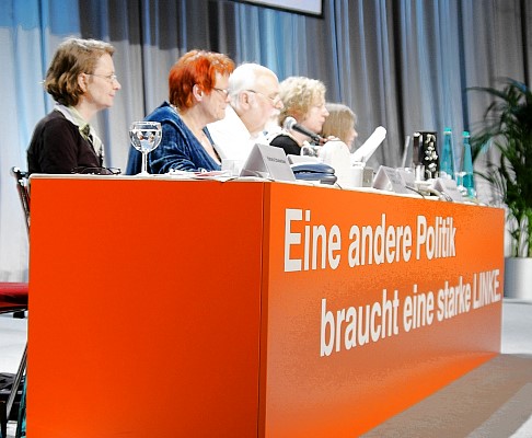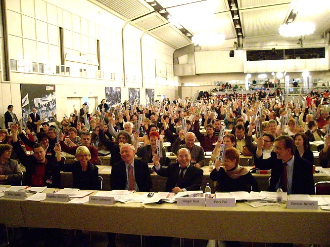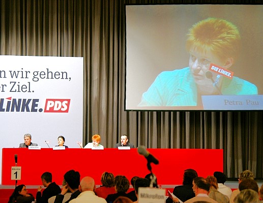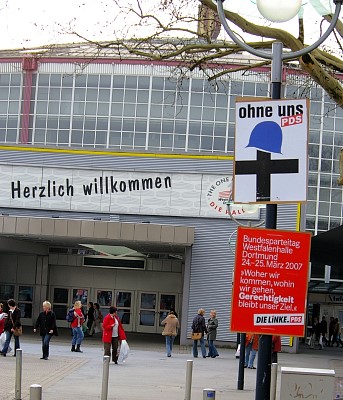 Die Delegierten der Linkspartei.PDS und der WASG tagten Wand an Wand in der Westfalen-Halle. Die jeweiligen Parteitage debattierten und beschlossen programmatische Eckpunkte, Satzungsfragen und weitere Gründungsdokumente für eine gemeinsame Linkspartei. Mit großen Mehrheiten stimmten die Delegierten der parallel beratenden Parteitage der Linkspartei.PDS (96,9 Prozent) und der WASG (87,7 Prozent) dem Verschmelzungs-Vertrag beider Parteien zu einer neuen Linkspartei zu. Dieser Beschluss muss nun durch Urabstimmungen in der Linkspartei.PDS und in der WASG bestätigt werden. |