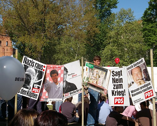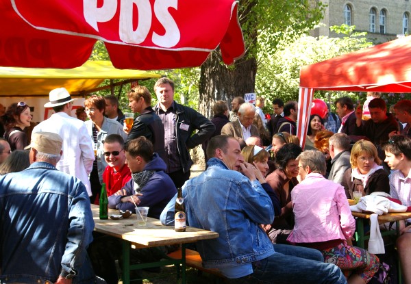 Auf dem Köpenicker Schlossplatz feierte die Linkspartei.PDS mit südamerikanischen Gästen und Rhythmen. Das multikulturelle Mai-Fest auf dem Mariannen-Platz in Kreuzberg zog erneut Zig-Tausende in ihren Bann. Die jahrelang in Kreuzberg zelebrierten Gewaltorgien blieben erneut aus. Das Fest am Bötzow-Viertel hat längst Tradition. Ebenso, dass Petra Pau und Klaus Lederer hier ihre Rundreise am 1. Mai mit einer Talkrunde beschließen.