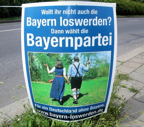 Farbe durch Plakate der Bayernpartei. Sie verspricht in Berlin-Prenzlauer Berg ein Deutschland ohne Bayern, sofern sie gewählt werde.