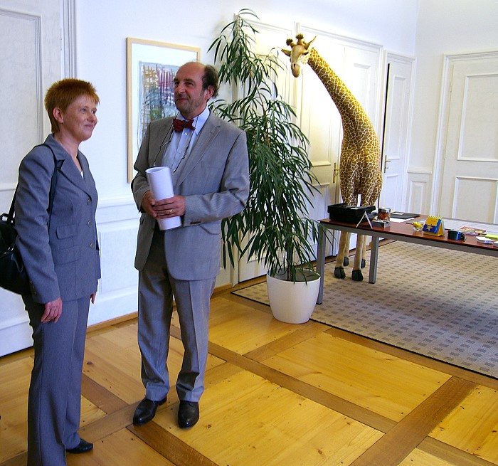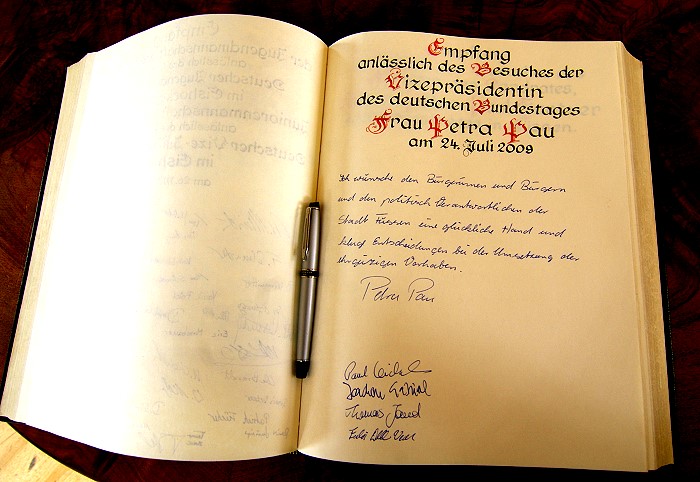 Außerdem führte der 1. Bürgermeister von Füssen, Paul Iakob (SPD), Petra Pau durch die Rathaus-Gemäuer, die früher ein Kloster waren. In Mindelheim wurde sie von Dr. Stephan Winter (CSU), ebenfalls 1. Bürgermeister, und von weiteren Stadträten empfangen. Beide Mal trug sie sich ins Goldene Buch der Stadt ein. Beim Redaktionsgespräch in der Allgäuer Zeitung ging es um Bildungspolitik. |