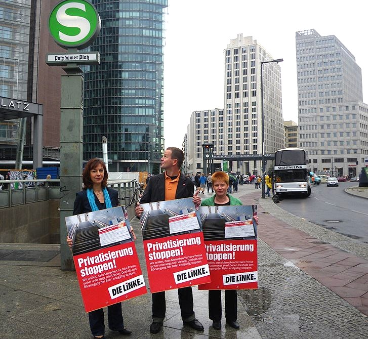 Am Potsdamer Platz, dem Hauptsitz der Bahn AG, wandten sich Kerstin Kaiser (Brandenburg), Klaus Lederer und Petra Pau (beide Berlin) gegen den immer noch geplanten Börsengang der Bahn. |