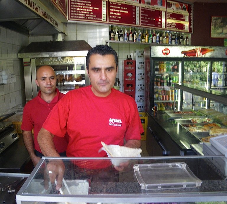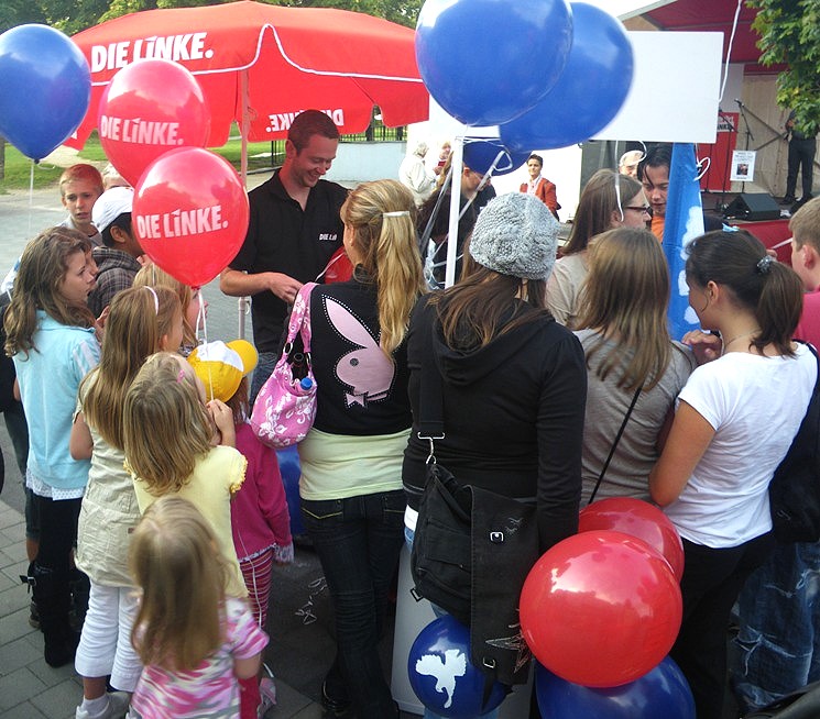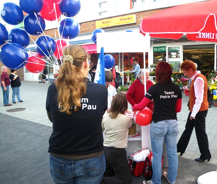 An den Info-Ständen herrschte Andrang. Das Team-Pau und weitere Helfer verteilten Wahlmaterialien. Selbst der Döner im benachbarten Imbiss wurde heute im roten T-Shirt mit der Aufschrift DIE LINKE serviert.