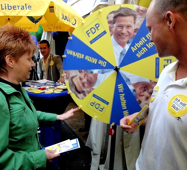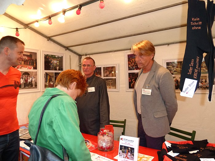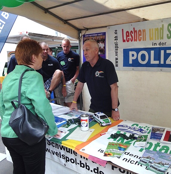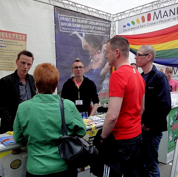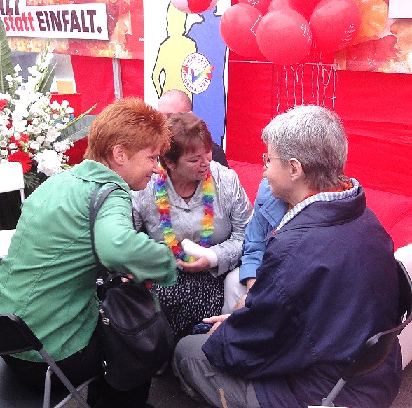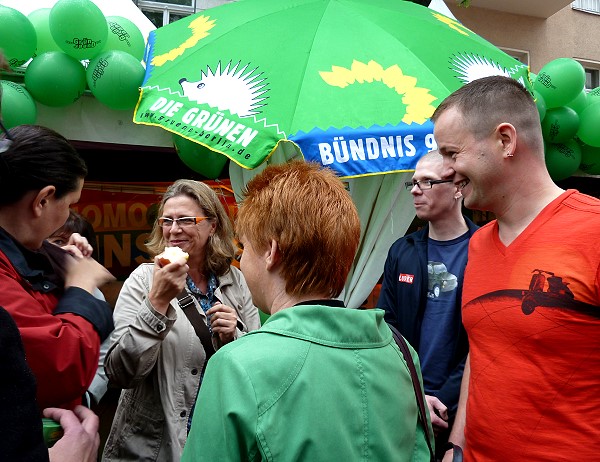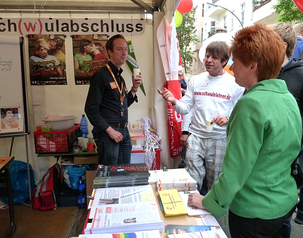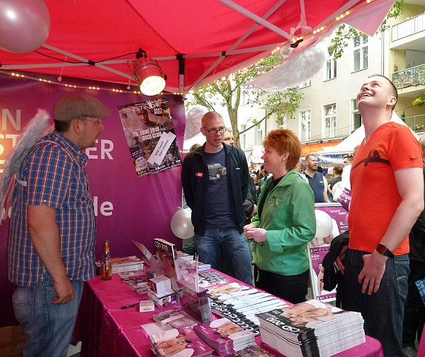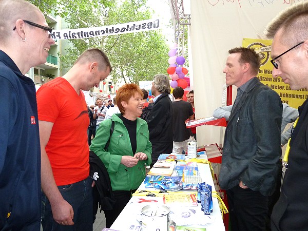 Buntes Treiben auf dem lesbisch-schwulen Straßenfest und Zeit für Gespräche: am Stand der Partei DIE LINKE, bei den Grünen, bei der SPD, bei der FDP. Mit von der Party war auch Klaus Lederer, Vorsitzender der Berliner Linkspartei sowie Mitglieder der Bundesarbeitsgemeinschaft queer der Linken. |