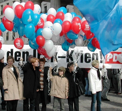 Die PDS beteiligte sich u. a. mit einer Aktion unweit des Reichstages. Petra Pau: Internationale Konflikte müssen friedlich gelöst werden oder sie eskalieren unkalkulierbar weiter.