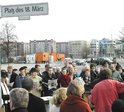 Am 18. März 1848 kapitulierte das Militär des preußischen Königs Friedrich Wilhelm IV. vor den Kämpfern für Freiheit und Demokratie. Jährlich erinnert daran eine partei-übergreifende Kundgebung auf dem Platz des 18. März am Brandenburger Tor. Wiederum dabei Petra Pau, während Senator Thomas Flierl (PDS) den US-Kriegskurs ablehnt. (s. a. www.maerzrevolution.de)