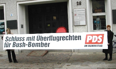 Das Grundgesetz enthält im Artikel 26 ein Friedensgebot. Es verbietet jede direkte oder indirekte Beteiligung der Bundesrepublik Deutschland an Angriffskriegen. Die PDS im Bundestag fordert daher: Schluss mit Überflugrechten für Bush-Bomber! Petra Pau: Bislang weigert sich der Bundestag dazu überhaupt eine Debatte zu führen!