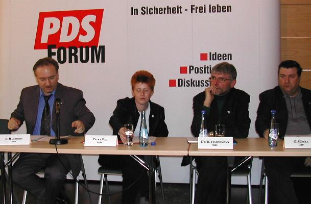 Tagung zur öffentlichen Sicherheit: Vertreter der GdP, Landes- und Kommunal-Politiker, Prof. Eike Hennig u Robert Lohde -Reiff von der Uni Kassel u. a. nahmen an der Veranstaltung der PDS-Landtagsfraktion teil. Schwerpunkte waren - neben der Kriminalitätsbekämpfung - die Prävention. Übereinstimmung: Kriegszenarien begründen keinen vorauseilenden Grundrechte-Abbau. Petra Pau: Die ‚Otto'-Kataloge' gehören auf den Prüfstand.
