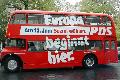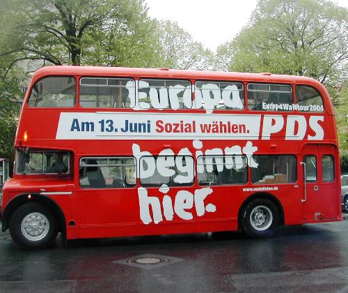 Seit dem 30. April tourt der rote Londoner Linienbus durch Deutschland. Bis zum EU-Wahltag fährt er 48 Städte an. Heute war in München Station. PDS-Vorsitzender Lothar Bisky und Petra Pau warben auf dem Marien-Platz dafür, am 13. Juni sozial zu wählen, also PDS. Petra Pau: Gehen Sie wählen. Der Aufwand ist gering, der Nutzen kann groß sein. (zur Rede)