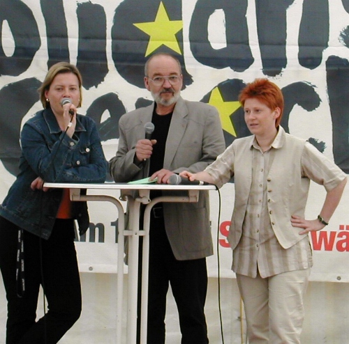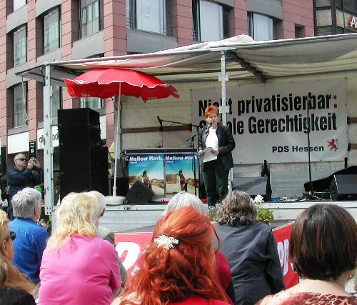 Petra Pau sprang kurzfristig für den erkrankten Gregor Gysi ein und sprach vor rund 250 Leuten auf einer Kundgebung der PDS-Hannover auf dem Steintor-Platz. Petra Pau: Wenn Sie eine EU besser finden, die friedlich ist, die sozialer wird und in der Sie mitbestimmen können, dann sollten Sie das auch zeigen. Nichtwählen stärkt die Falschen.