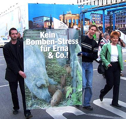 Attacke in Berlin nannte sich ein Protestzug verschiedener Initiativen gegen das Bombodrom in der Kyritz-Ruppiner Heide. Hoch zu Ross, per Kutsche oder zu Fuß forderten die Demonstranten in Bundestags-Nähe eine zivile und tourismusfreundliche Zukunft für die Nord-Ost-Region. Petra Pau war mit einem Poster ihrer Paten-Sau Erna nebst Ferkel dabei.