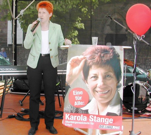 Am 7. Mai werden in vielen Thüringer Städten und Landkreisen Bürgermeister, Oberbürgermeister und Landräte neu gewählt. Die Linkspartei.PDS ist mit über 60 Kandidatinnen und Kandidaten dabei. Petra Pau warb heute in der Landeshauptstadt für einen gesetzlichen Mindestlohn, für direkte Demokratie und für die Kandidatin der Erfurter Linkspartei.PDS, Carola Stange.
