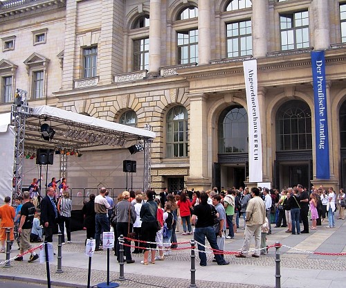 Tausende kamen ins Berliner Abgeordnetenhaus und in den benachbarten Bundesrat, die heute zum &132;Tag der offenen Tür geladen hatten. Vor dem Preußischen Landtag gab es Musik, Kultur und Sport, drinnen vor allem Parteien, Verbände und immer wieder Gespräche. Auch Gesine Lötzsch und Petra Pau waren am Stand der Linksfraktion im Abgeordnetenhaus dabei.