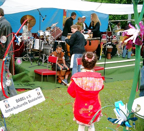 27. 05. 2006, Berlin, Marzahn-Hellersdorf: Viele Trommeln - ein Rhythmus war heute die internationale Trommelsession mit Künstlern aus Afrika, Lateinamerika und Asien im Haus Babylon überschrieben. Petra Pau gehörte zu den zahlreichen Gästen des multikulturellen Zentrums, die mit ihrem Kommen ein Zeichen gegen Fremdenfeindlichkeit und Rassismus setzen wollten.