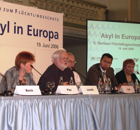 In der Französischen Friedrichstadtkirche veranstaltete die Evangelische Akademie mit dem UNHCR ein Symposium zum Flüchtlingsschutz. Vor dem Dom demonstrierte die Aktion Hiergeblieben. Petra Pau diskutierte auf dem Podium mit Bundespolitikern anderer Parteien am Beispiel Asyl über widersprüchliche Schwierigkeiten, EU-Recht in nationales Recht umzusetzen.