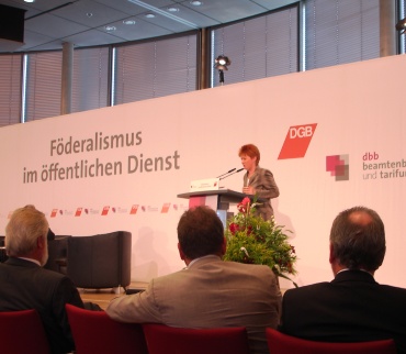 Mit einer gemeinsamen Veranstaltung im dbb-Forum protestierten heute der Beamtenbund und der DGB gegen die geplante Föderalismus-Reform. Vertreter aller Bundstagsfraktionen waren als Gäste geladen. Petra Pau begründete das Nein der Fraktion DIE LINKE zu dem Vorhaben. Damit wird das Verfassungsziel auf gleiche Lebensverhältnisse geopfert.