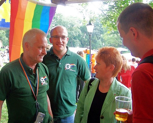 Tausende strömten heute auf das lesbischwule Parkfest im Volkspark Friedrichshain. Die Arbeiterwohlfahrt und das Bezirksamt hatten erneut die Schirmherrschaft übernommen. Vereine, Initiativen, auch Parteien, stellten sich, ihre Angebote und Programme vor. Petra Pau wurde als Vize-Präsidentin des Bundestages begrüßt. Es war ein buntes Treiben.