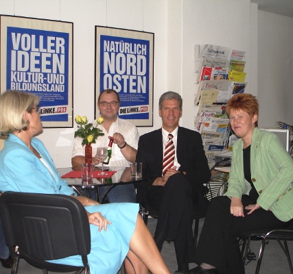 Am 17. 09. 2006 sind Landtagswahlen. Heute eröffnete die Linkspartei.PDS ihr Wahlquartier, mit den Schweriner Direktkandidaten, Angelika Gramkow und Helmut Holter. Petra Pau war dabei. Auch danach auf dem Forum mit 150 Interessenten, bei der es quer Beet durch die aktuelle Innen- und Außenpolitik ging, von Hartz IV bis Nah-Ost.