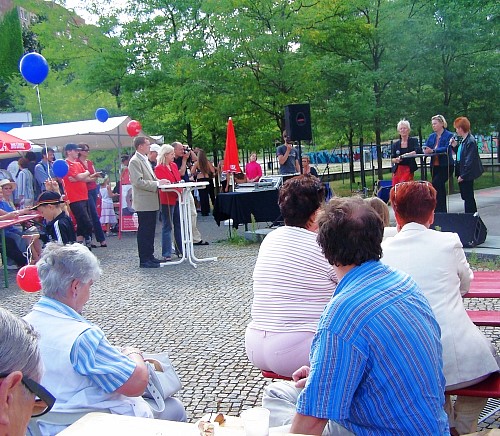 Lyra e.V. ist ein Berliner Verein zur Förderung der Integration für deutsche Aussiedler und Spätaussiedler aus dem Gebiet der ehemaligen Sowjetunion. Gemeinsam mit der Linkspartei.PDS veranstaltete er heute auf dem Armin-Platz in Marzahn ein Fest mit Musik, Tanz und Talkrunden. Zu den gefragten politischen Gesprächspartnern gehörte auch Petra Pau.