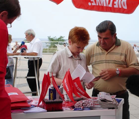 Traditionell tourt die Linkspartei.PDS im Sommer durch die Ostsee-Bäder. Heute, in Kühlungsborn und Sanitz, war auch Petra Pau wieder dabei. Es gab Gespräche am Strand und am linken Info-Stand, eine Visite beim CDU-Bürgermeister und ein gut besuchtes Bürgerforum - quer Beet durch die Bundes- und Landspolitik, von Hartz IV bis zum Nahost-Konflikt.
