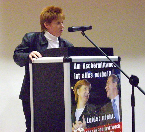 Erneut sprach Petra Pau auf dem Politischen Aschermittwoch der Linkspartei in Stuttgart. Sie nahm den Abgang Edmund Stoibers und den Abschuss von Bruno zum Anlass für einen Streifzug durch die aktuelle Politik. Stichworte ihrer Rede waren Demokratieverdruss & Rechtsextremismus, Ackermann & Hartz, Steinmeier & Kurnaz und anderes mehr. (⇒ zur Rede);(⇒ Video, 7 MB)