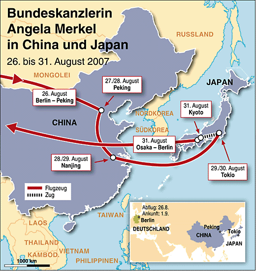 Der offizielle Besuch in der VR China endete heute mit der Einweihung eines "Siemens"-Werkes. Dann wechselte die Regierungs- und Parlamentsdelegation nach Japan. Die Mitglieder des Bundestages trafen sich mit der japanisch-deutschen Parlamentariergruppe des Unterhauses. Die Themen reichten von Afghanistan über den Nahen Osten bis zum Doping und dem Eisbären Knut.
