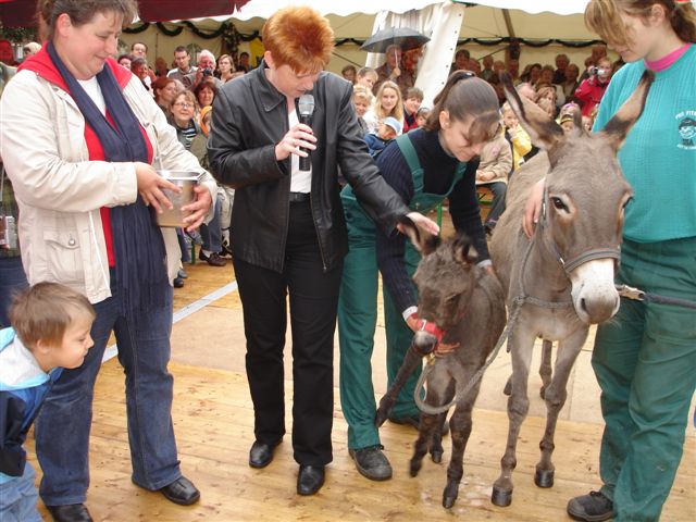 In Alt-Marzahn, auf dem schönsten Dorfanger Berlins, wird das traditionelle Erntefest gefeiert. Seit neun Tagen gehört auch ein Esel-Kind zu den Bewohnern. Petra Pau übernahm die Patenschaft und taufte es auf den Namen Elli. Danach ging es mit Bezirksbürgermeisterin Dagmar Pohle (DIE LINKE.) weiter zum Familien- und Seniorenwandertag.