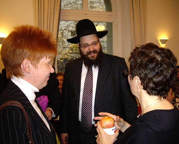 07. 11. 2007, Berlin: Geburtstagsempfang in der Synagoge Oranienburgerstraße, Irene Runge wurde heute 65 Jahre alt. Petra Pau gratulierte mit einem Granatapfel, der laut jüdischem Brauch Glück bringt. Irene Runge wurde in New-York geboren, studierte und publizierte in der DDR, gründete zu deren Ende den Jüdischen Kulturverein Berlin, der sich seither praktisch um Integration kümmert.