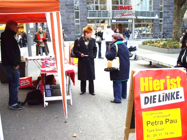 Petra Pau besuchte heute die Arbeitslosen-Initiative im Ver.di-Haus und die Stadtteil-Initiative Nordstadtbüro Gießen. Zwischen durch warb sie auf dem Markt für DIE LINKE, denn am 27. Januar 2008 finden in Hessen Landtagswahlen statt. Abends diskutierte sie in der Universität mit Tjark Sauer mit Bürgerinnen und Bürgern über Bürgerrechte im Würgegriff.