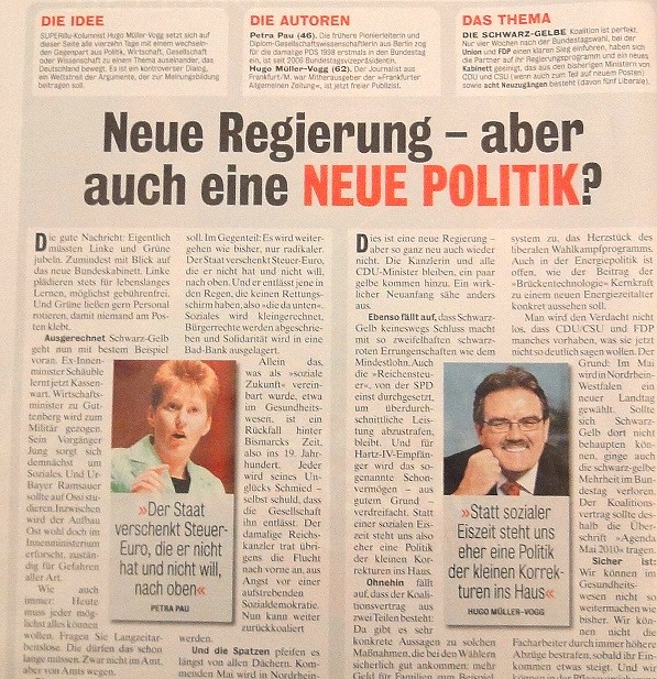 Neue Regierung - neue Politik? Das war die Frage, auf die in der aktuellen SUPERillu Hugo Müller-Vogg (Publizist) und Petra Pau ihre Meinung kundtun. Petra Pau würdigte das Personal-Karussell der CDU/CSU im Merkel-Kabinett. Sie kritisierte die Steuerpolitik der Koalition und sie prophezeite, dass nach der NRW-Wahl die Katze aus dem Sack gelassen wird. (Beiträge: ⇒ Müller-Vogg / ⇒ Pau)