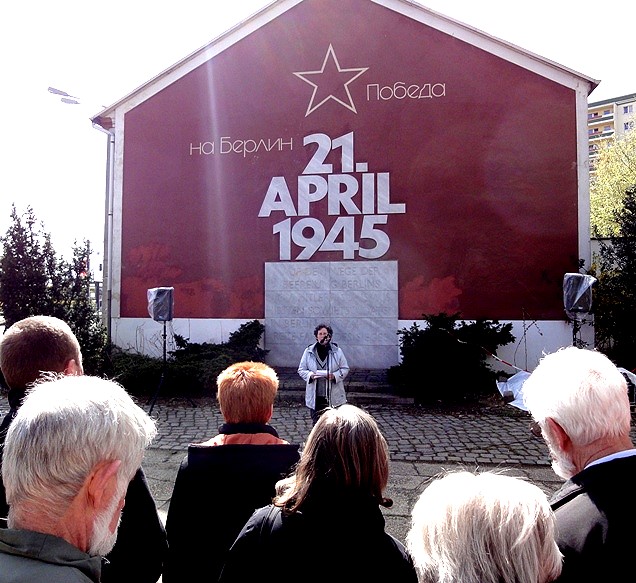 Am 21. April 1945 erreichte die Rote Armee Berlin. Davon kündet das damals erste Haus am Marzahner Stadtrand. Bürgerinnen und Bürger gedachten heute auf Einladung der Partei DIE LINKE, der SPD und der Grünen des historischen Ereignisses, auch Petra Pau. Danach wurden noch Blumen an der Bersarin-Brücke niedergelegt, benannt nach dem ersten Stadt-Kommandanten Berlins.