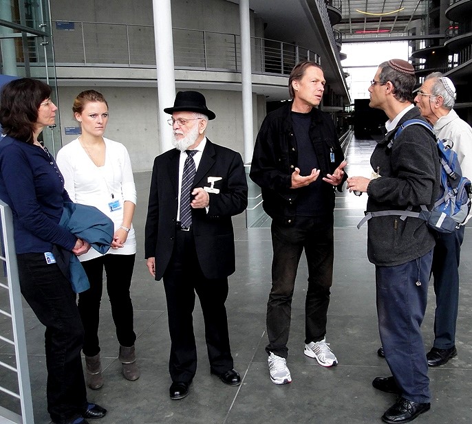 Rabbiner Dr. Chaim Rozwaski von der Synagoge Lev Tov in Charlottenburg besuchte heute mit zwei Freunden aus Israel das Büro Petra Pau. Julia, Ute und Helmut führten die Gäste durch das Parlaments-Viertel. Ihr Interesse galt vor allem der alten und neuen Architektur in den Hauptgebäuden, sowie jüdischen Spuren in deutschen Parlamenten, etwa Walter Rathenau.
