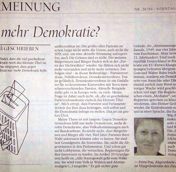 ZurückGESCHRIEBEN heißt eine Sonntags-Rubrik im Berliner Tagesspiegel. Dort forderte Petra Pau heute Volksentscheide auch auf Bundesebene. Mich erregt, dass Parteien und Parlamente derzeit das ihre dazu beitragen, sich selbst und die Demokratie infrage zu stellen. Spiegel-online übernahm Passagen und löste damit kontroverse Debatten aus. (⇒ zum Tagesspiegel-Beitrag)