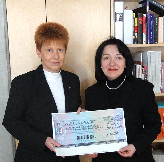 Petra Pau sprach heute mit Petra Rosenberg, Vorsitzende des Landesverbandes der Sinti und Roma Berlin-Brandenburg. Sie übergab ihr eine Spende des Vereins DIE LINKE. Das Geld ist ein Beitrag für Informationstafeln, die Auskunft über die Geschichte geben werden, die hinter dem Otto-Rosenberg-Platz in Berlin-Marzahn steht: der Völkermord an Sinti und Roma.