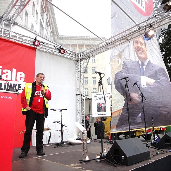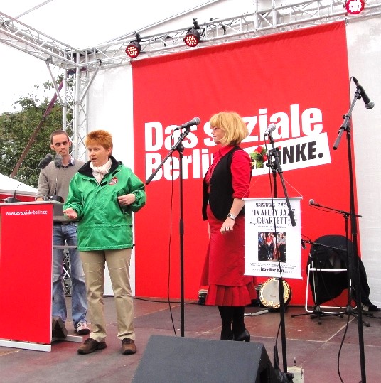 Die Wahl-Tour der Berliner Linken mit Jazz und Spitzen-Personal führte heute nach Neukölln in die Karl-Marx-Straße. Mit dabei waren auch Gregor Gysi, Gesine Lötzsch, Harald Wolf und Petra Pau. Danach unterstützte Petra Pau in Marzahn-Hellersdorf den Straßenwahlkampf von Manuela Schmidt am Eastgate. Kommenden Sonntag wird in Berlin gewählt.