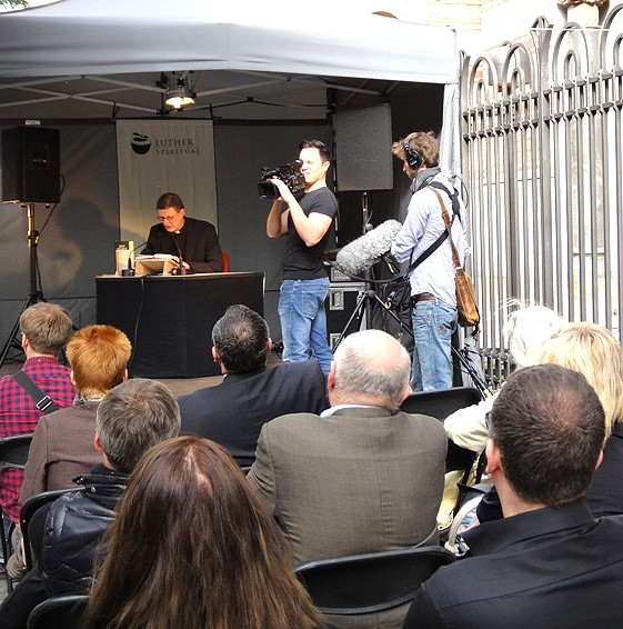 Vier Tage lang findet vor dem Centrum Judaicum ein Lese-Marathon Die drei Bücher der Weltreligionen statt, organisiert von Pfarrer Felix Leibrock. Als Petra Pau heute da war, wurde gerade aus der Hebräischen Bibel Hosea mit all seinen Drohungen und Strafen vorgetragen. Bekannte Persönlichkeiten lesen außerdem aus dem Koran und aus dem neuen Testament.
