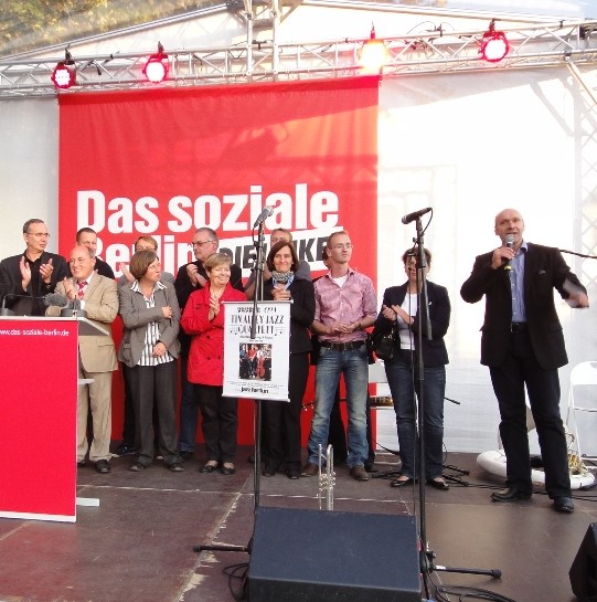 Auf dem Schlossplatz in Köpenick endete heute die 12-tägige Wahlkampf-Tour der Berliner Linkspartei. Petra Pau war wieder dabei. Gregor Gysi warf der Bundesregierung Komplettversagen in der Euro-Krise vor. Harald Wolf kritisierte die SPD für ihre Dauerblockade in der Mietenpolitik und die Grünen für ihre Pläne, die S-Bahn zu privatisieren und den ÖBS abzuschaffen.