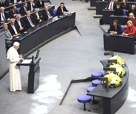 Im Rahmen seines drei-tägigen Deutschland-Besuches sprach Benedikt XVI. heute im Plenum des Bundestags. Er referierte über Politik, Recht und Gerechtigkeit. Einige Abgeordnete, auch der Linksfraktion, entzogen sich der Rede. Etliche von ihnen demonstrierten zeitgleich in Berlin mit Zehntausend Teilnehmerinnen und Teilnehmern unter dem Motto Keine Macht den Dogmen.