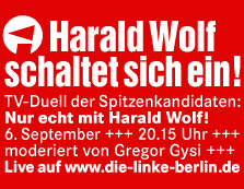 Der Rundfunk Berlin-Brandenburg (SFB) hat es abgelehnt, den Spitzenkandidaten der LINKEN, Harald Wolf, zu einer Wahldiskussion einzuladen. Auf Sendung dürfen nur Henkel (CDU), Künast (Grüne) und Wowereit (SPD). Petra Pau: Die öffentlich-rechtliche Ignoranz nimmt zu! DIE LINKE bietet Dienstag daher parallel im Internet einen Livestream Gysi fragt Wolf an.