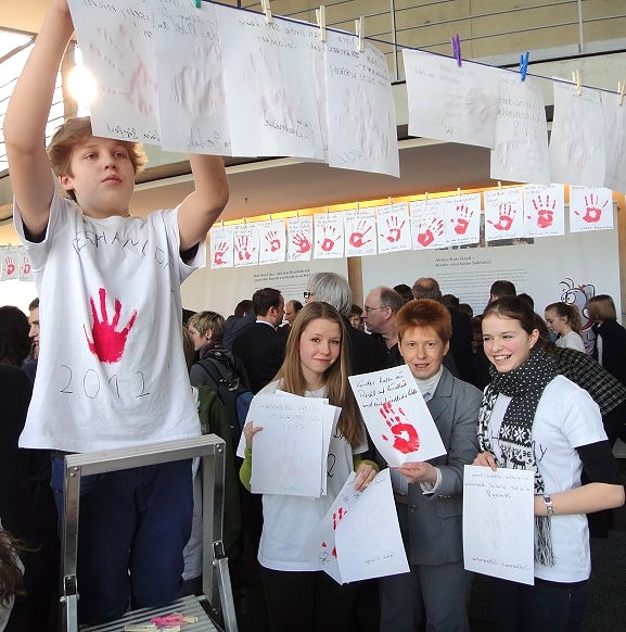 Seit 2002 finden jeweils am 12. Februar, dem red hand day, weltweit Aktionen gegen den Missbrauch von Kindern als Soldaten statt. So konnten heute Abgeordnete und Mitarbeiter im Bundestag Erwartungen und Forderungen formulieren und diese mit rot bemalter Hand besiegeln. Petra Pau schrieb: Kinder haben ein Recht auf Kindheit und auf eine friedliche Welt.