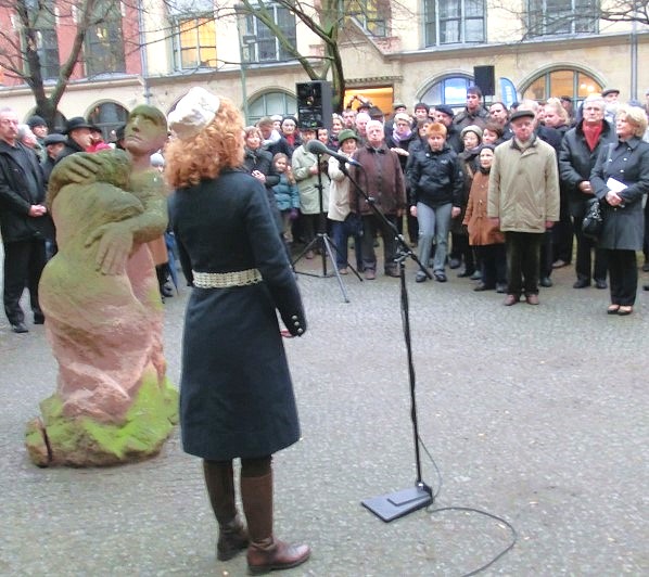 Als Fabrik-Aktion wird die Verhaftung von Berliner Juden im Februar 1943 bezeichnet, die bis dahin als Zwangsarbeiter von der Deportation verschont geblieben waren. Familienangehörige, vor allem Frauen sammelten sich zum Protest, mit Erfolg. Daran erinnert in der Rosenstraße eine Skulptur. Heute wurde der Geschichte gedacht, Petra Pau war dabei.