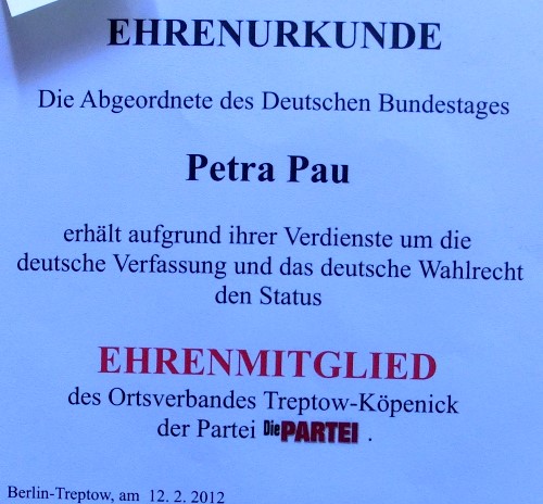 Seit gestern sind Petra Pau und weitere MdBs der Linksfraktion Ehrenmitglieder der Partei DIE PARTEI. Anlass war ein Antrag zur Änderung des Wahlrechts durch die Sonneborn-Regel. Die Ehrenurkunden wurden vom PARTEI-Chef selbst auf einem Festakt überreicht. Halina Wawzyniak hielt die Dankesrede. Und Frank Tempel berichtete samt Fotos.