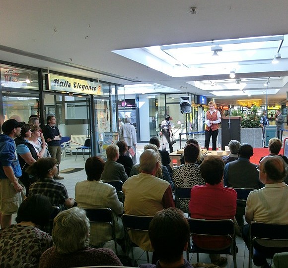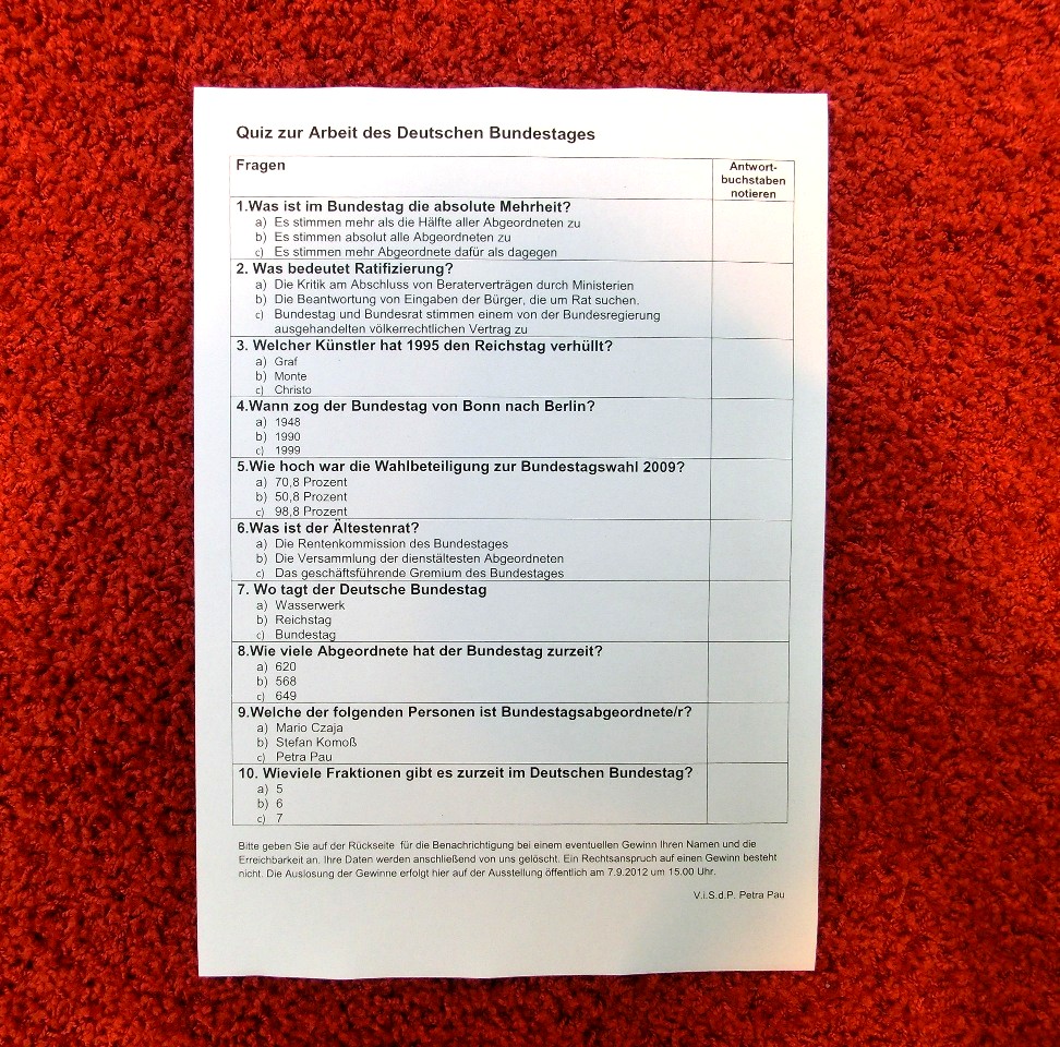 Nach der Fraktionsklausur bot Petra Pau heute am Rande der Wanderausstellung des Bundestags im Spree-Center eine spontane Sprechstunde für interessierte Bürgerinnen und Bürger an. Es ging um soziale Fragen, Bildungspolitik und ausufernde Outdoor-Bedürfnisse. Besucherinnen und Besucher können sich zudem an einem Quiz beteiligen (⇒ siehe Foto)