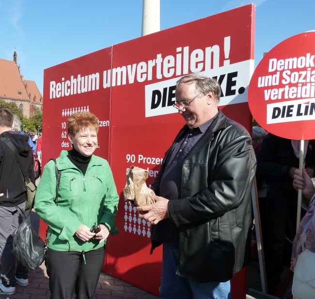 Zu einem Aktionstag hatte das Bündnis Umfairteilen heute aufgerufen. In 40 deutschen Städten sollen sich insgesamt 40.000 Bürgerinnen und Bürger beteiligt haben. Petra Pau nahm in Berlin teil. Hintergrund ist die zunehmende Spaltung der Gesellschaft in zunehmend mehr Arme und Wenige, die immer reicher werden. Die Kernforderung: Reichtum besteuern.