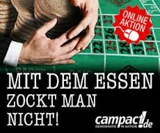 Campact, das Web-Portal für politische Mitmischer, lädt wieder zu einer Kampagne ein: Mit dem Essen zockt man nicht. Die Spekulation mit Lebensmitteln treibt deren Preise hoch und höher. Immer mehr Menschen werden in den Hungergetrieben. Dazu wieder eine 5-Minuten-Info. Mit einem Massenbrief soll nunmehr Finanzminister Schäuble aktiviert werden. (⇒ zum Brief)