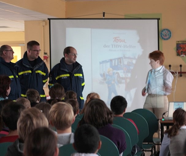 Gleich vier 4. Klassen waren heute in die Aula der Peter-Pan-Grundschule gekommen. Auf ihrem Stundenplan stand Vorlesetag mit Petra Pau. Sie las aus dem Buch Tom der THW-Helfer. Derweil waren leibhaftige Kameraden des Technischen Hilfswerks mit großem Gerät vorgefahren, das anschließend begriffen und bestiegen werden konnte.