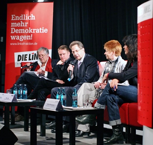 13. 03. 2013, Berlin: Verfassungsschutz - zwischen Reform und Auflösen, hieß eine Veranstaltung der Fraktion DIE LINKE im Pfefferberg. Auf dem roten Sofa war Hans-Georg Maaßen, Präsident des Bundesamtes, für Reformen. Petra Pau und Jan Korte hingegen plädierten dafür, ihn als Geheimdienst aufzulösen. Vordem gab Petra Pau einen Überblick zum NSU-Nazi-Skandal. (⇒ zum Beitrag)