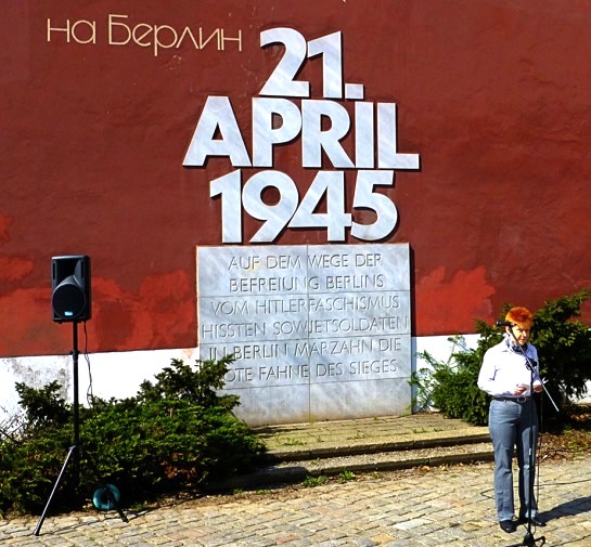 Am 21. April 1945 erreichten die Sowjetarmee sowie polnische Soldaten im Nordosten Berlin. Ein Hausgiebel verweist darauf. Heute erinnerten wieder Bürgerinnen und Bürger an dieses Ereignis. Bis zur Kapitulation des Hitlerregimes und der Befreiung vom Faschismus am 8. Mai vergingen allerdings noch tödliche Wochen. Petra Pau sprach dazu.